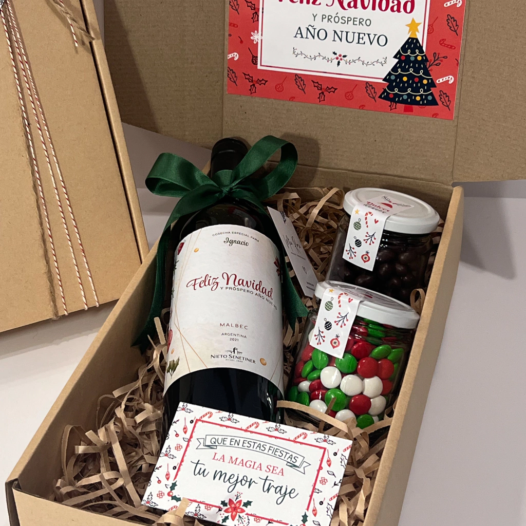 🍷 Box Navidad - Vino Trapiche Personalizado Celebra la Navidad con un regalo que irradia calidez y estilo. Nuestro Box Navidad es la elección perfecta para sorprender a tus seres queridos y amigos en esta mágica temporada. Este exclusivo conjunto incluye: